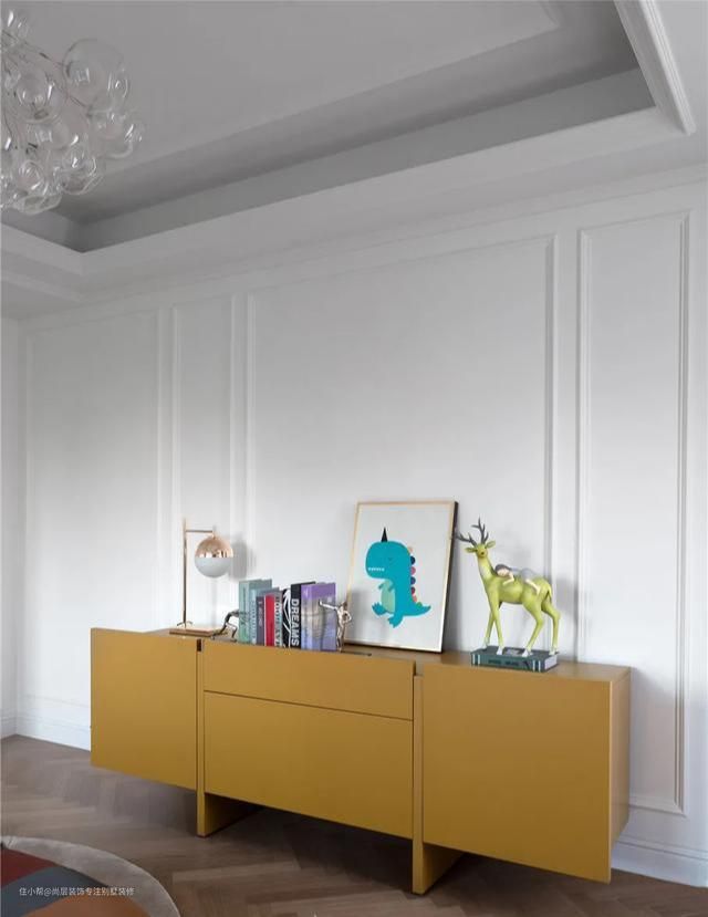 吊顶的设计结合白色的背景,将人的纵向视线拉长,感受空间大气的艺术氛围;精美的吊灯,黄色的金属,彰显生活品质。