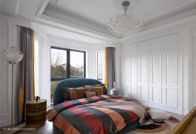 次卧主要以满足功能为主,隐形白色衣柜,结合透明水晶吊灯,姜黄色床铺的融入,增强了空间的装饰性,让生活变得更有艺术气息。