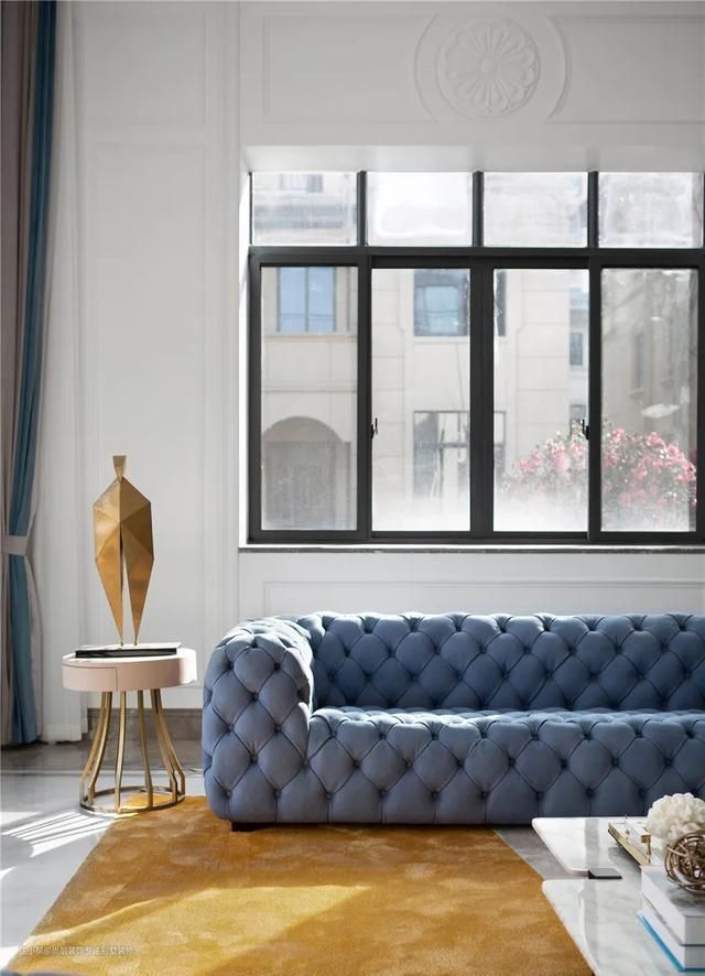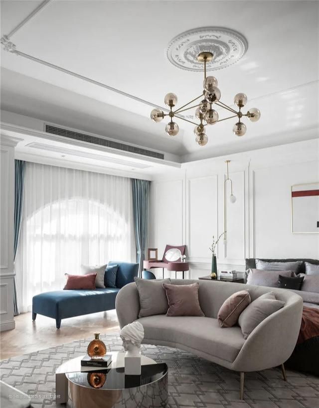 拱形的窗户,体现法式建筑的经典格调,蓝色的现代贵妃椅,保证空间功能性的同时,也彰显了主人的文化底蕴。