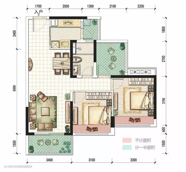 这种户型的客餐厅位于玄关两侧,客厅和餐厅都有自己独立的空间,中间留有正常合理的过道。