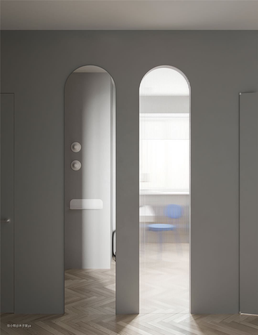 长虹玻璃用在衣帽间门、阳台门、浴室门、厨房门也是非常好看的,不会阻挡视线,又会有朦胧的透光,竖条花纹视觉延伸,带点神秘感。
