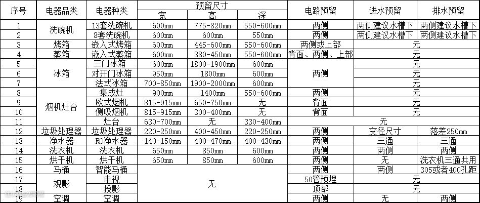 全屋家电尺寸预留及水电要点,一张表格教你搞定