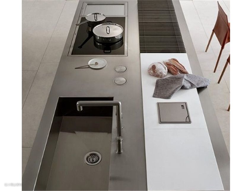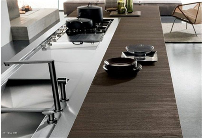 比如灶台、水槽、备菜区、餐桌等都呈现在一个平面上,这样岛台看过去整齐划一,