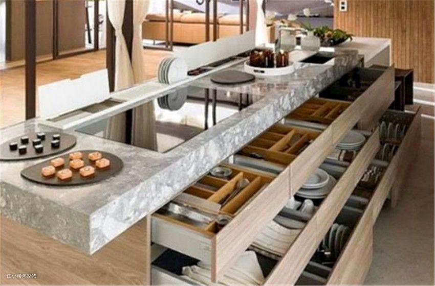 这时候不妨也把岛台的下面空间利用起来,可以做成抽屉的样式,平时放置一些餐具和厨具;