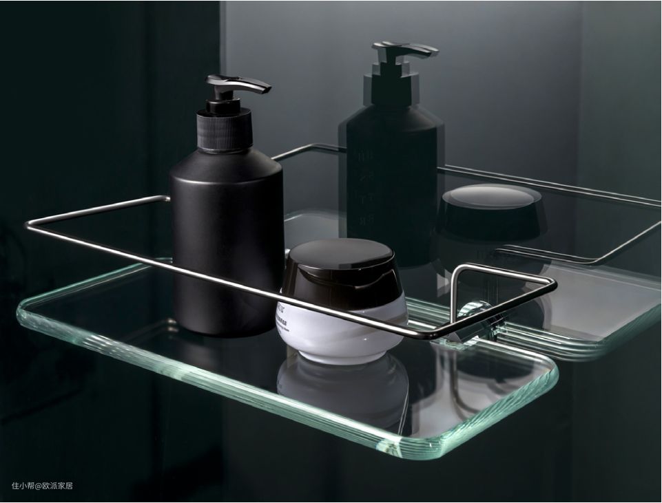 淋浴房玻璃搭配小挂件使用,巧妙扩容。置物层架与淋浴房组合安装,可用来放置洗面奶、刷子等小物品,除此之外,如挂钩一类的小物件同样可以收纳沐浴用品,起到扩容作用。