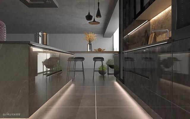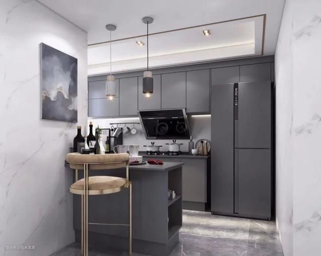 厨房空间较大则可以使用纯度低、明度高的收缩色黑灰来打造高级感,让厨房看起来内敛而克制。