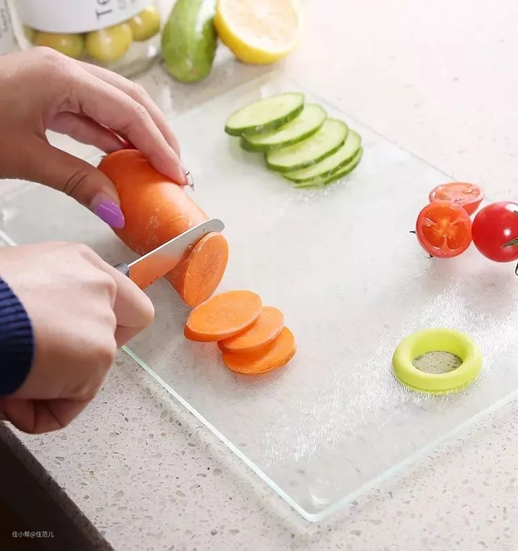 一般选用的钢化玻璃做磨砂或特殊纹理处理,还有直接选用鼠毛钢化玻璃,背面四角有硅胶防滑垫或整面菜板硅胶包边,确实切上去不打滑不留刀痕。