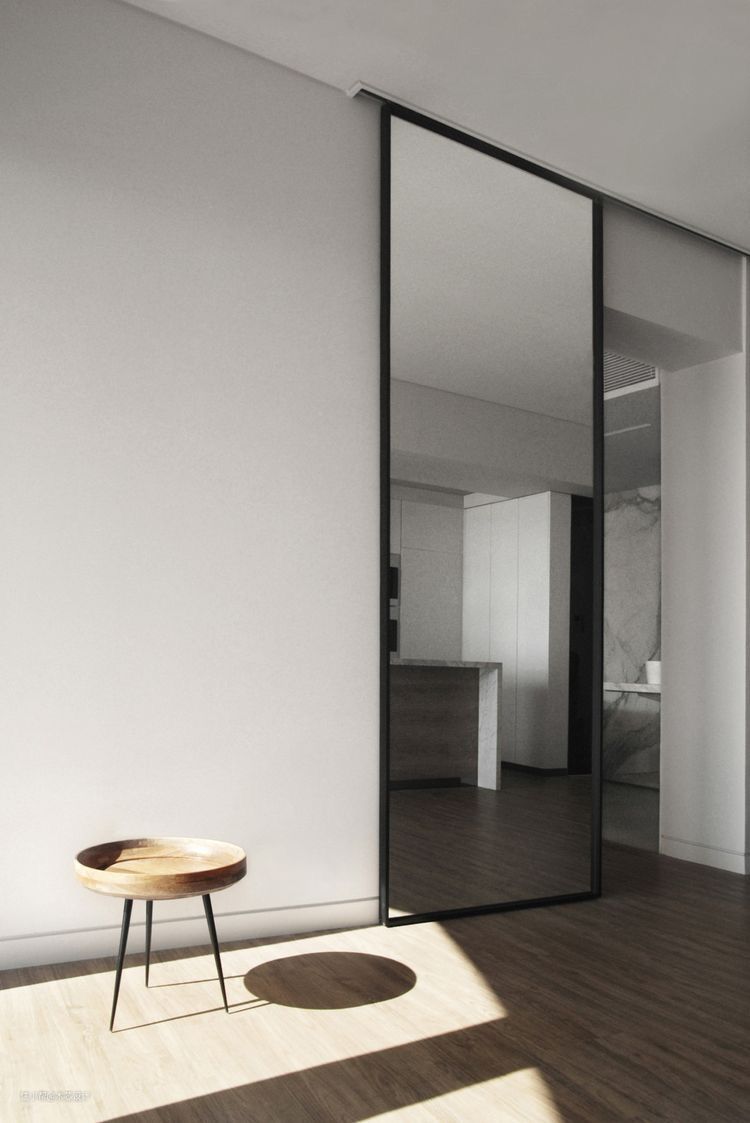 现在市面上还有这种镜子材质的谷仓门,可以当作镜子来用,也可以作为隔断门,一门多用。