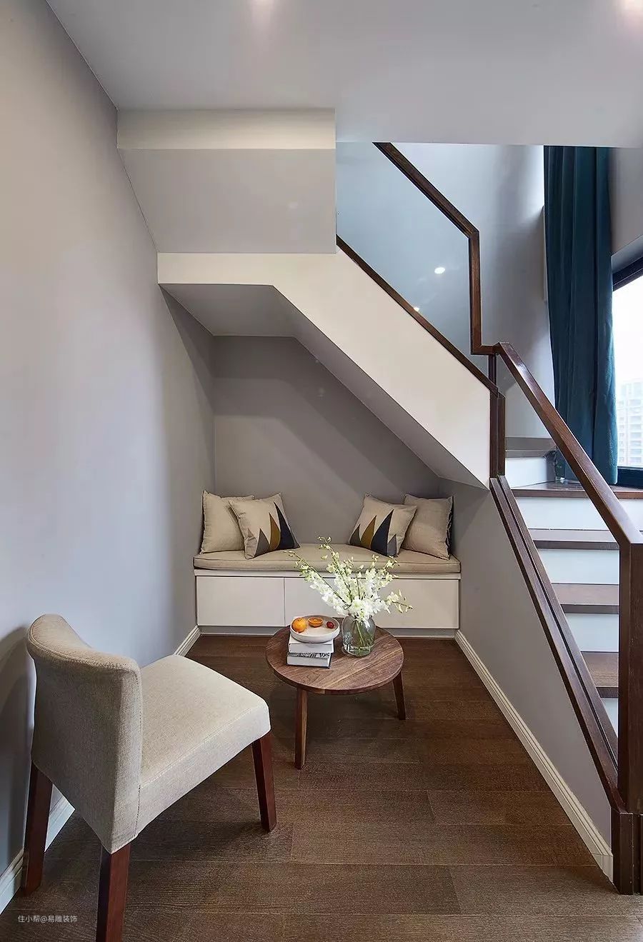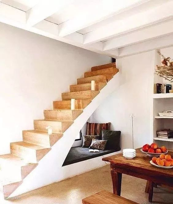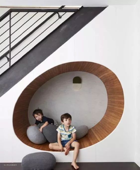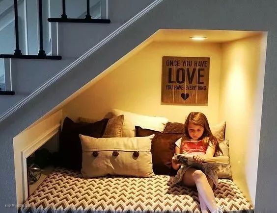 在高度允许的前提下,将楼梯中部挖空设计成一个温馨舒适的休闲区,平时用来看书、休憩、聊天,或者为孩子营造一个特殊的“秘密基地”,可以赋予生活更多的情调。