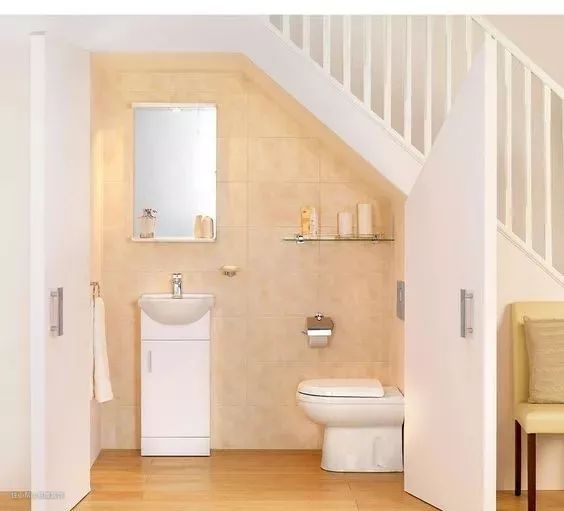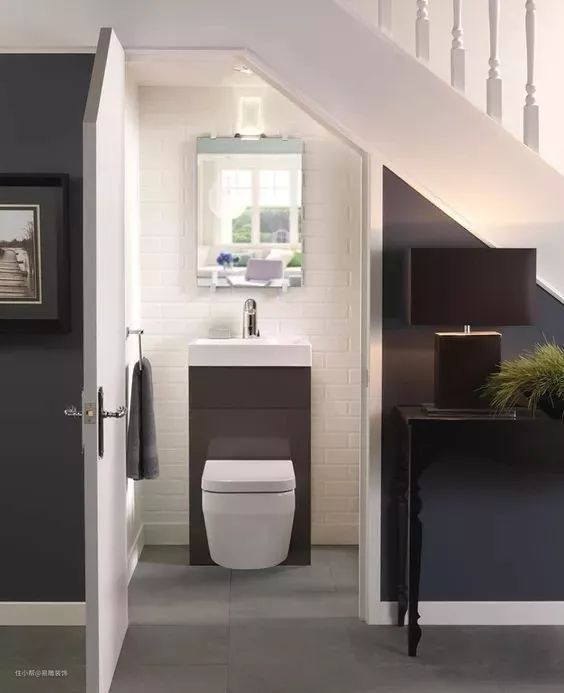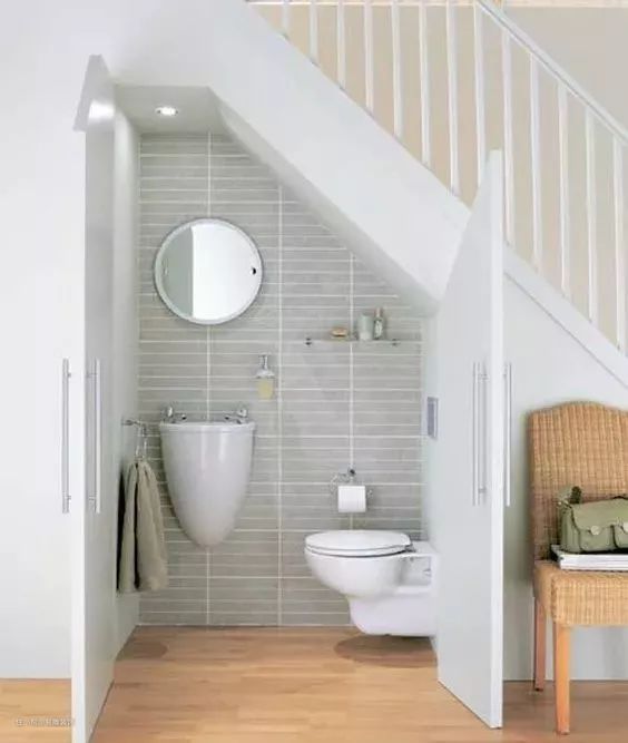 如果家里有楼梯的话,就不妨利用楼梯下的畸零角落打造一个小小的次卫,将壁挂式马桶、洗漱柜合理地规划进去,抑或是直接将两者融为一体,都是提升家居幸福感的小技巧。