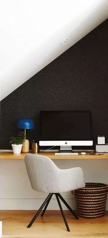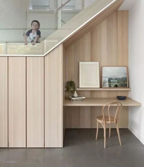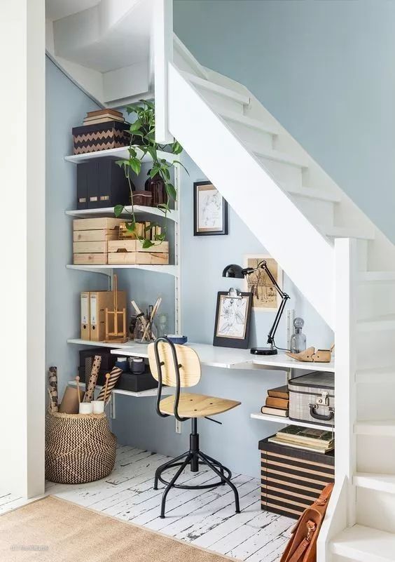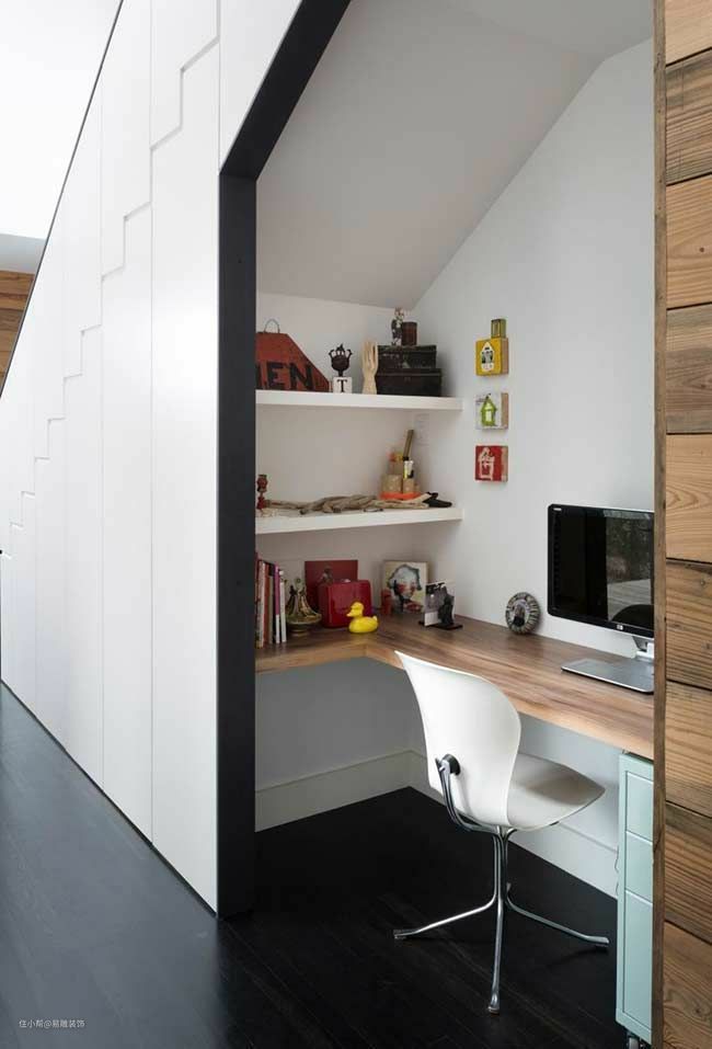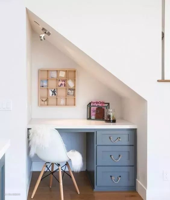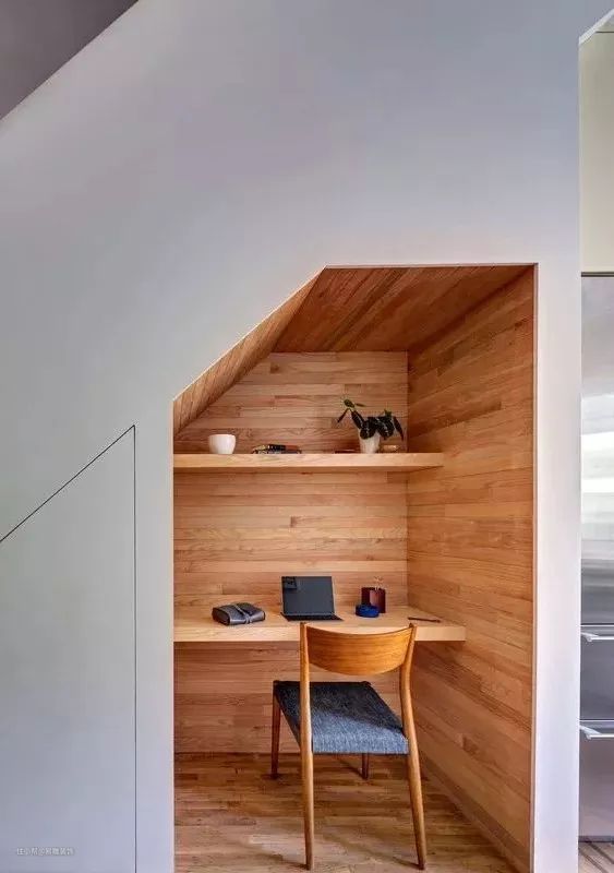 根据楼梯下方的斜角造型,为家里打造一个精致的小型书房,也不失为一个很好的创意。