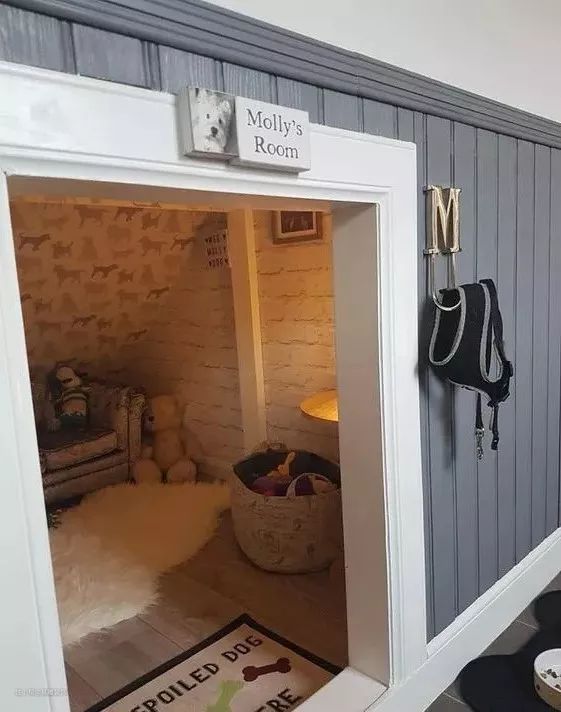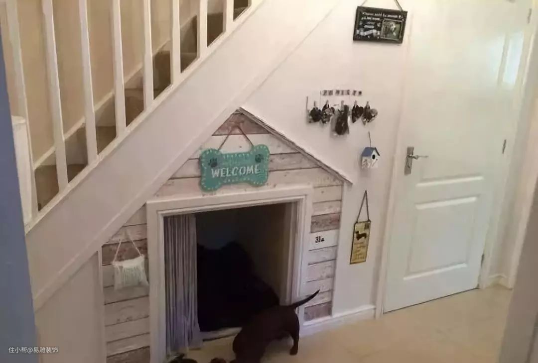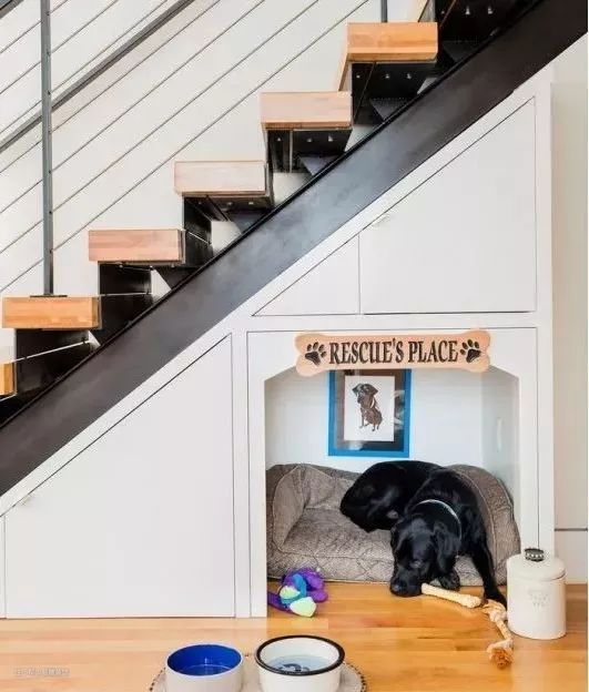 对于家有宠物的人来说,能够为自己的宠物打造一个专属的睡觉空间,是一件多么值得开心的事情。而在楼梯下方采用嵌入式设计,为它们安置一个温暖舒适的“新家”,就能大大提高空间利用率,又让你的爱猫、爱犬享受到更好的待遇。