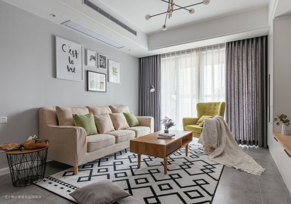 客厅延续北欧风格的简洁大气,主色调是低调高级灰,再佐以明艳亮丽的次色彩点缀,丝毫没有任何压抑的感觉。蓬松柔软的沙发,个性十足的条纹地毯,镂空铁艺边几,这些客厅家具组合没有太多繁复冗杂的约束,简简单单却敞亮舒心。