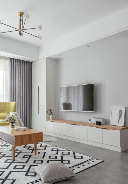 想要将自己的小家搭出大户型的感觉,用白色调是最恰当的。如果你觉得整个家都是白色的会有点沉闷,那么不妨家具以白色为主,墙面可以选择浅灰色调,低调的同时有大气感。电视组合柜子的结构,也是满足了小家的各种收纳要求。