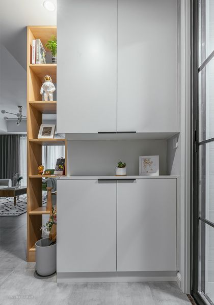 户型上本身是没有玄关位置的,所以刻意设计的这个置顶柜子,以及侧边木格展示柜,成为了玄关的一处亮丽的景色。展示柜上各种摆件,旅游照片等等都可以放置,一进家门就感受到家的温馨,这也是我家装修想要突出的理念。