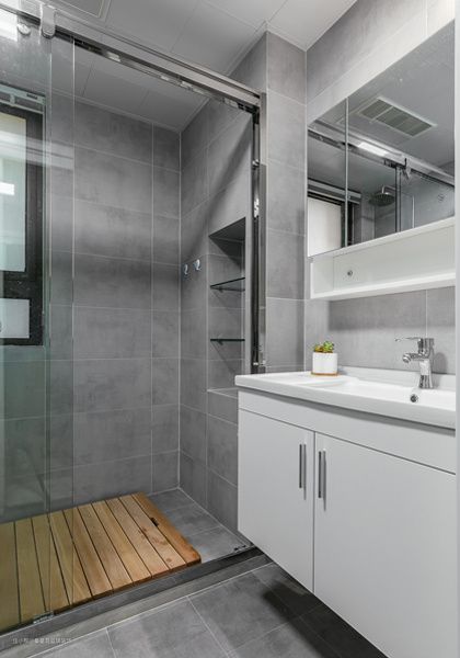虽说高级灰有低调大气的装饰效果,但是在卫生间内用这种颜色,另外一个考量就是耐脏性。干区与湿区划分明确。多功能储物镜柜与浴室柜,以及壁龛的结构设计,让小空间内的收纳完全没有问题。
