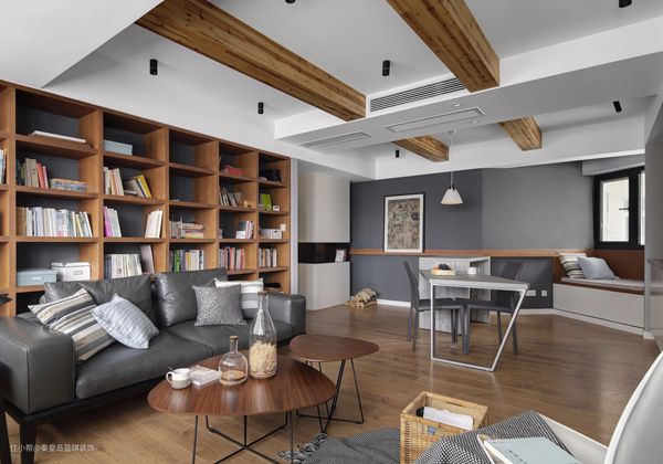 如果说,拥有一方天地是可以同时融入各种功能,这样的格局布置,应该会受到很多人的喜爱吧。在白色的天花板上选择胡桃色实木作为装点,在视觉上给人种层次感。餐客厅均选择开放式的设计,实木地板上就是各类家具的摆放,沙发茶几以及餐桌椅子成为生活必备品。之所以喜欢这方天地的装饰,是因为在在家具的选择上,突破常规的设计,创意的造型可以给枯燥的生活带来无限乐趣。此外就是餐厅旁飘窗的装饰,它的存在让居室瞬间拥有些许灵动气息,将墙面改造成书墙,实木柜被镶嵌在墙壁表面,增添书香韵味。在闲暇之时,到书架上选取一本书籍,无论是躺在沙发上还是坐在窗台上阅读,都能成为一道亮丽的风景线。