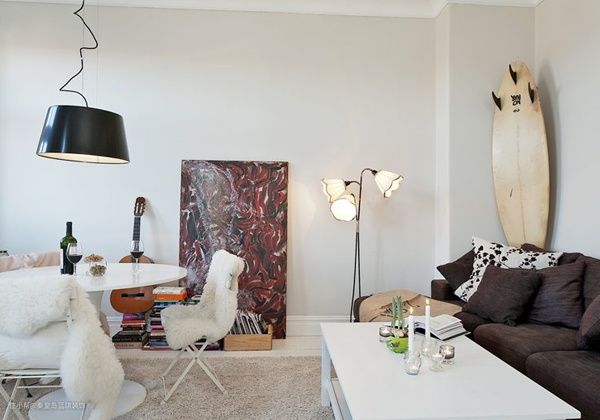 采用白色作为空间主色调,因为这是百搭的色彩,方便各种颜色的搭配,家具的摆放。深咖色的沙发与白色的实木茶几组成cp,满足日常使用。在一旁的欧式铁艺吊灯下,摆放着餐桌椅,照亮这方天地。在这里,无论是窝在沙发中看电影还是在餐桌上享受美食,都是惬意时光的赐予。在周末,可以邀请三五好友前来做客,如果有条件的话可以自己烹饪,聚集在一起,听听音乐聊聊愿望。毕竟,闲置的吉他也需要利用起来,让动感音符飘荡在空间中,让欢笑充满整个居室。