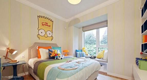 利用卡通头像做装饰,让简洁的房间不单调,辛普森就在你的床头,是很多男孩子喜欢的系列。米白色+浅黄色的装饰,让整个房间显得非常温馨。
