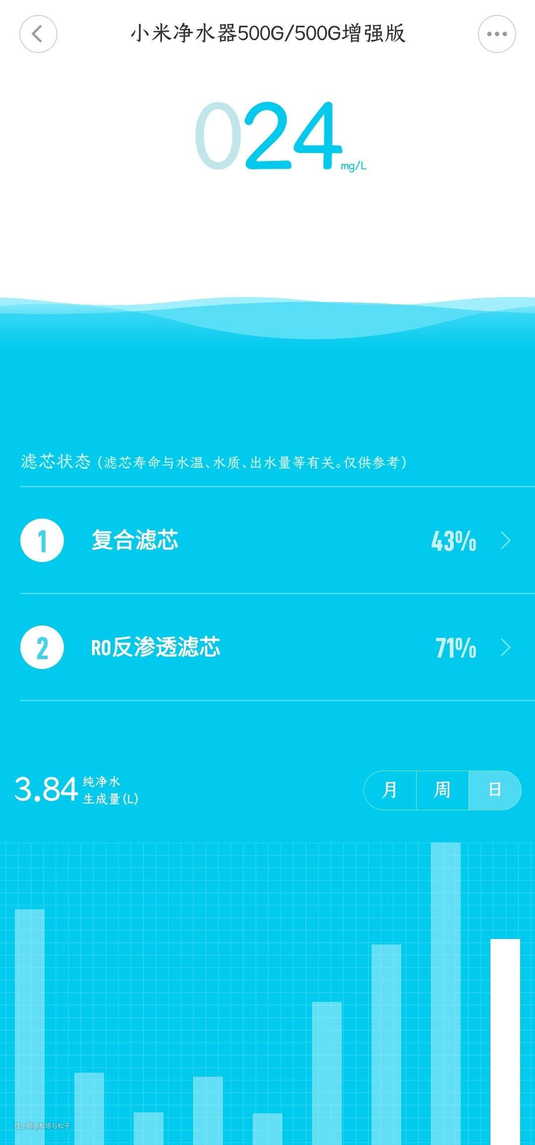 我家选择的是小米净水器500G增强版,米家里会显示滤芯状态,可以直观的看到滤芯的状态。最下方的柱形图会显示每天纯净水生成量,还能看到每次用水的时间点和时长,以前从不知道的数据,现在都能清楚的查阅了。