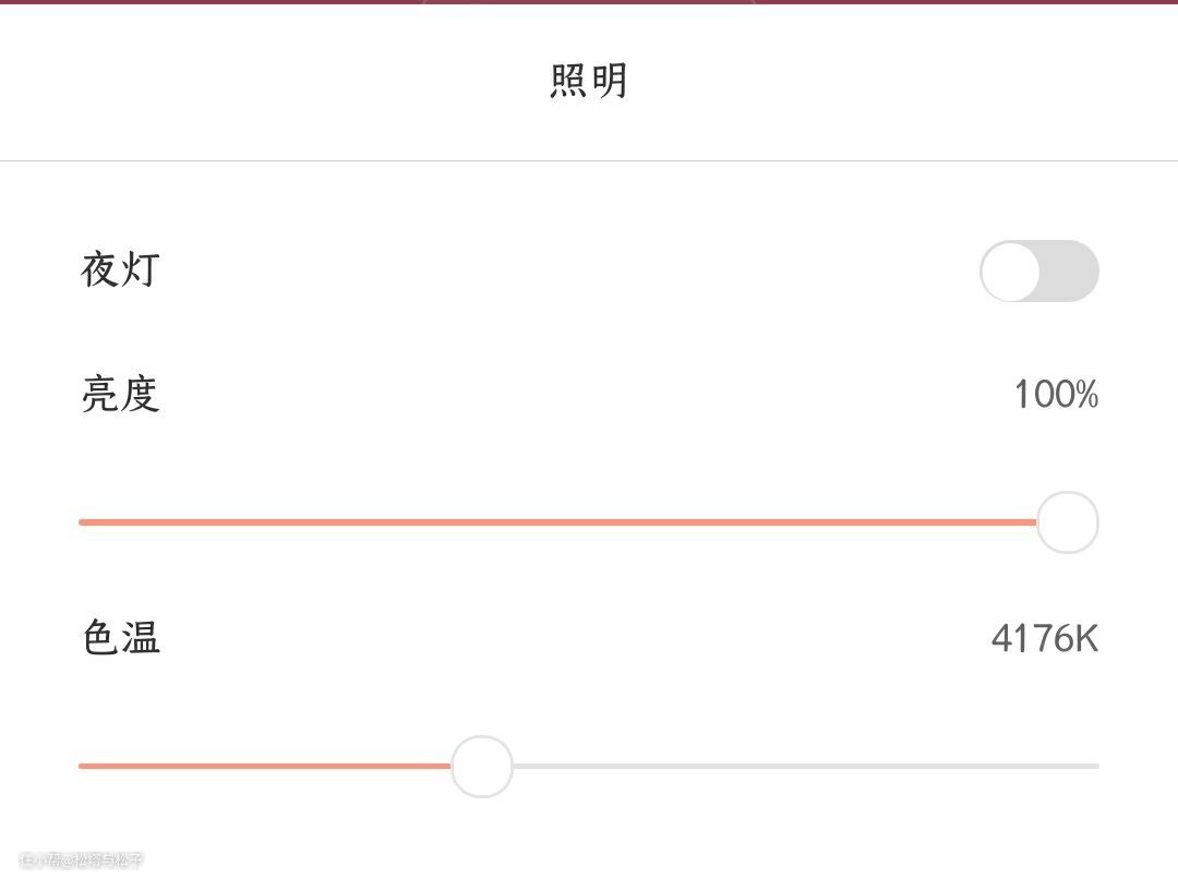 照明可以调节亮度,色温调节范围从2700k—6500k,还有夜灯模式,可以根据时间和场景设置不同的灯光。