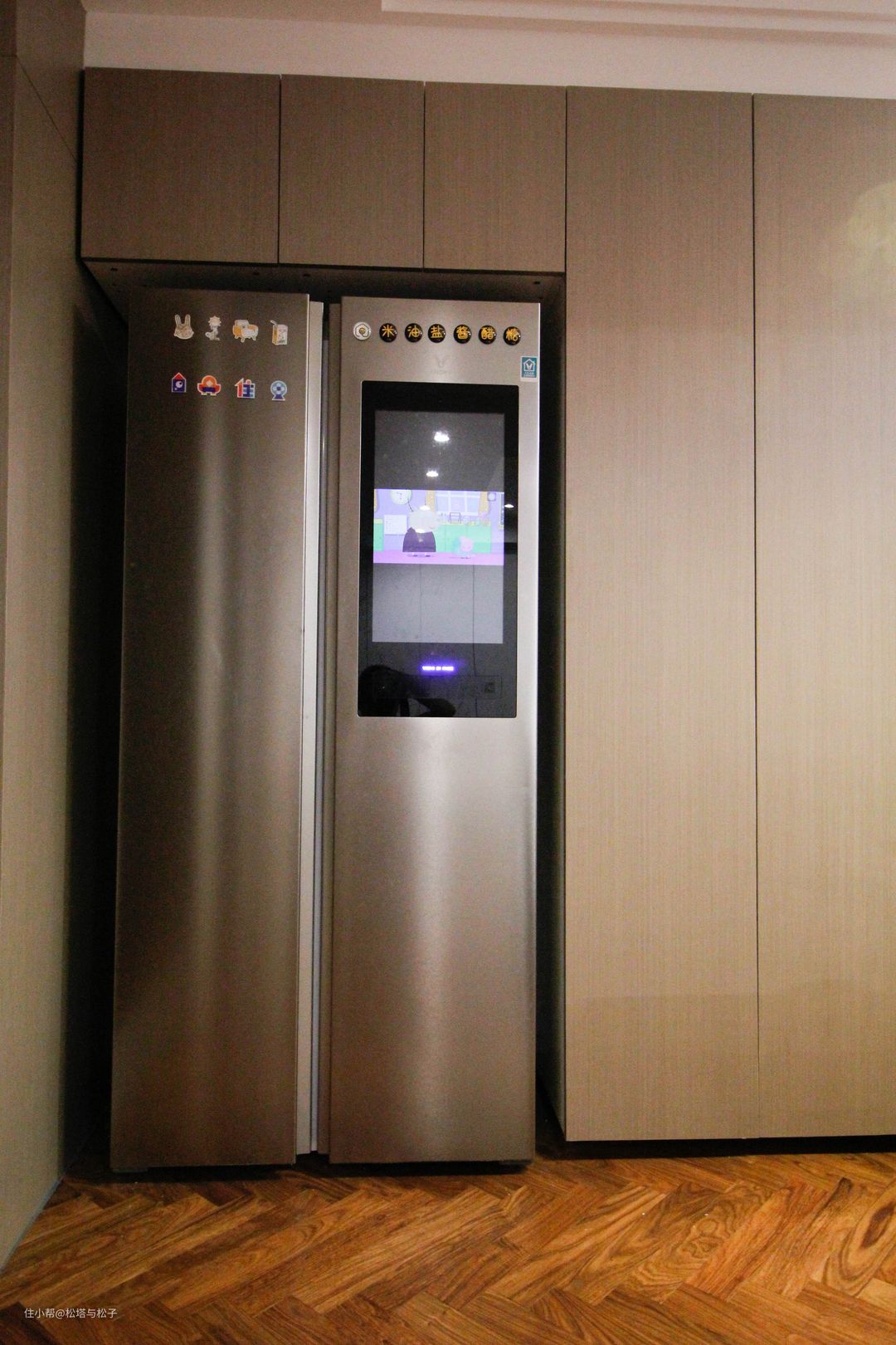 很多人质疑冰箱上要屏幕干啥,哄娃还不够吗。孩子在家不太看投影,就让他用冰箱看会儿电视,不需要她舒服,觉得不舒服不爱看就达到我的目的了。位置在宝宝餐椅左边,孩子吃完饭给他放集动画我才能好好吃饭呀。