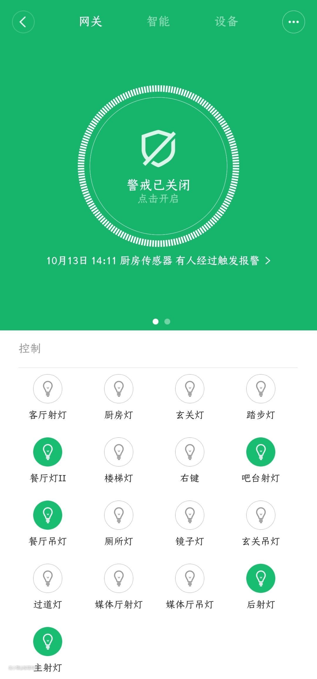 全屋智能控制的话,每个楼层都需要布置一个,需要插电使用,占用一个三孔电位!点开网关可以看到接入这个网关被控制的设备。