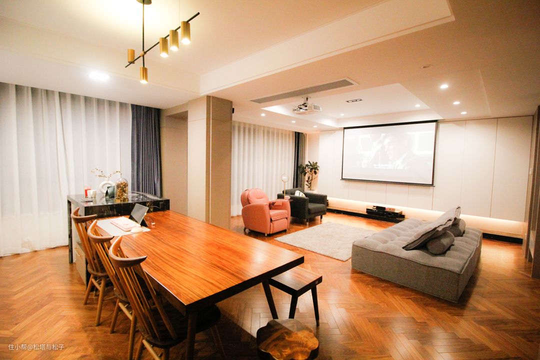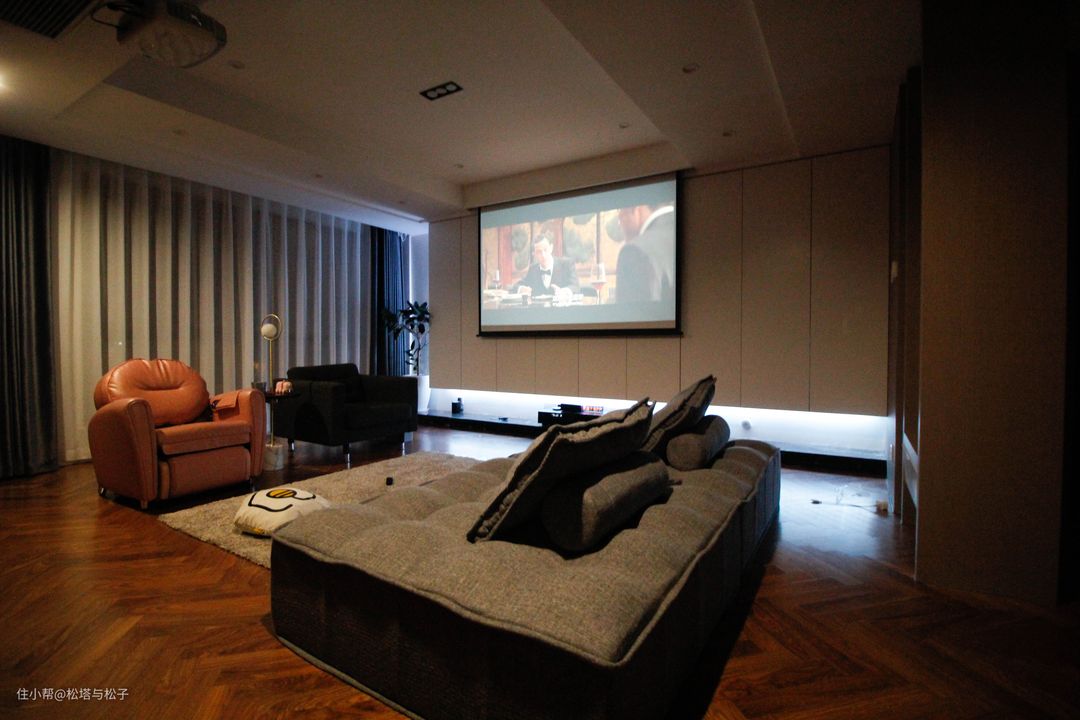 这个场景中,设备依次运作,包含电动幕布、功放、低音炮、投影仪、电动窗帘、客厅顶灯、氛围灯带:它需要依次执行的原因在于,电动幕布是缓缓放下,不可能是“啪”一下一步到位,投影仪需要预热,不是一开即亮立刻进入工作模式的,从打开到可以输入音频内容是存在时间差的。通过为设备设置延时开启,实现最终一分钟变成电影院。