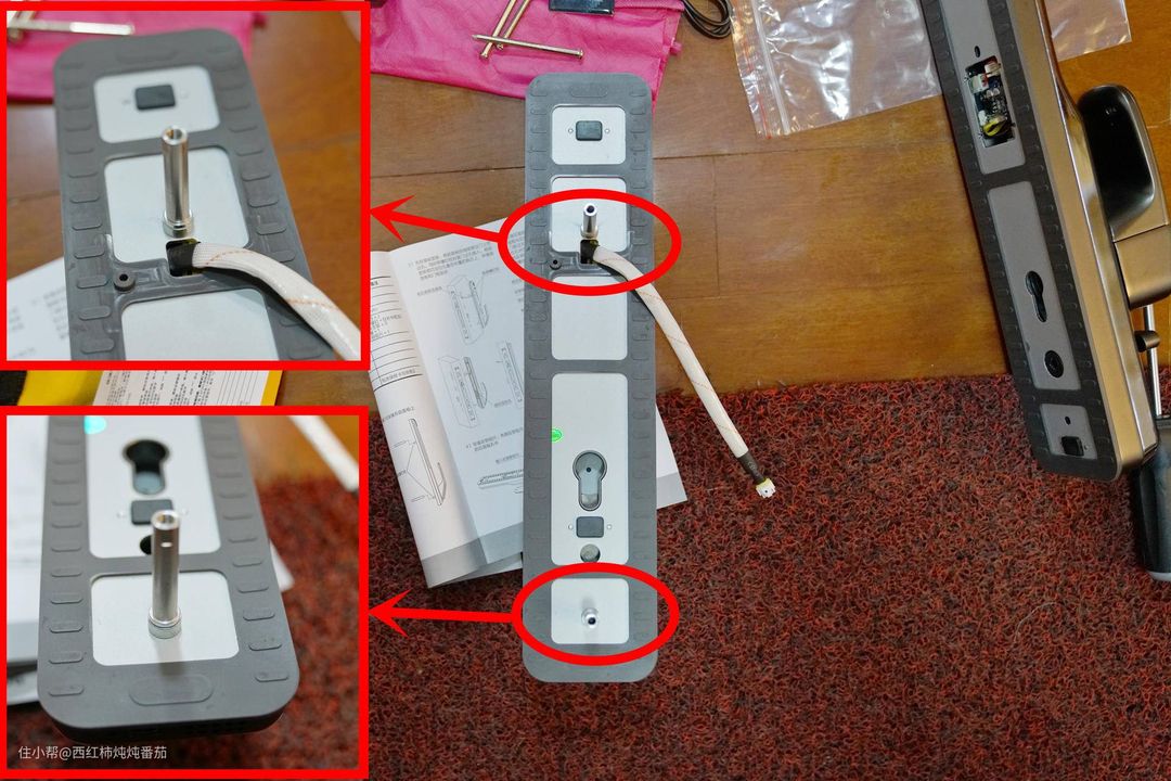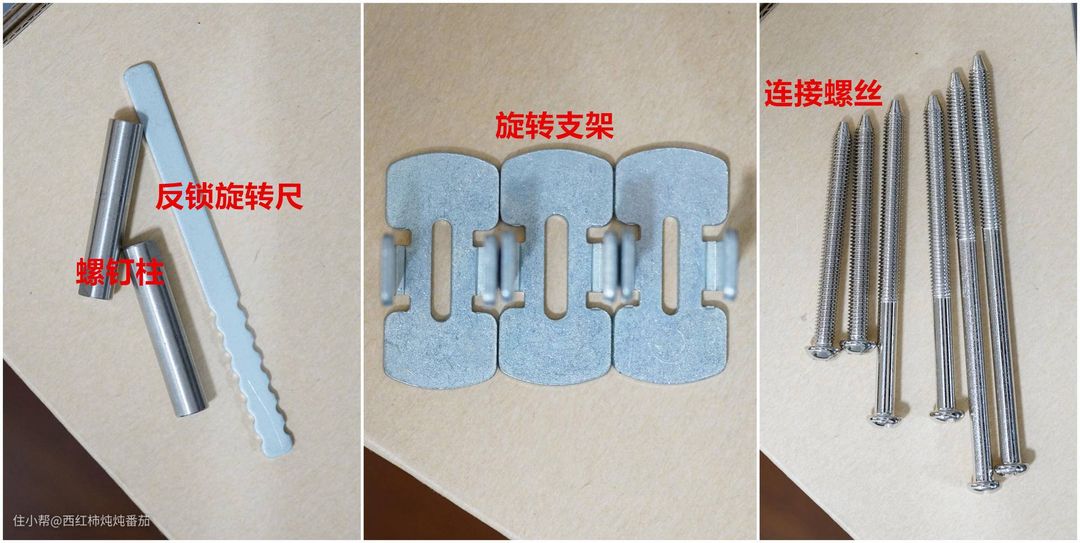 其中旋转支架三选一,选择中间缝隙跟门锁厚度最贴近的即可;连接螺丝也是三(对)选一,根据门厚确定。