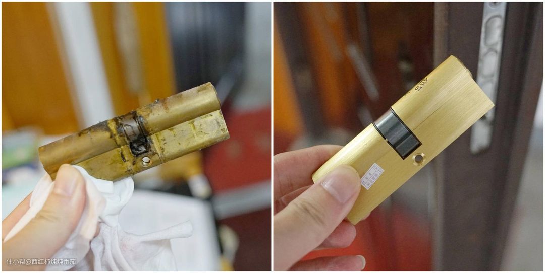 不过楼主在安装过程中遇到一点小插曲:原来的锁芯经过十几年的使用变得不太灵敏,于是索性换了个安全等级更高的新产品(楼主是临时找当地开锁匠买的,各位如果想一起换掉锁芯,可以提前买好,100元以内可以搞定)▲