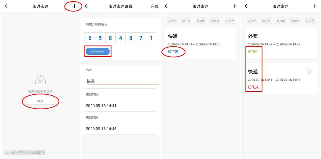 另外,假如有快递或者访客过来,而自己又不在家,还可以使用临时密码开锁。生成临时密码后,需要访客在面板输入 5#完成激活(下发),否则临时密码一直都是“待下发”状态 ▲