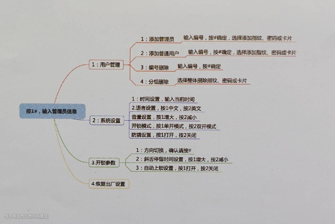 关于这款指纹锁的操作,说明书有详细介绍。刚收到的指纹锁,任意手指都能解锁,因此最好第一时间进行设置。初始密码也就是管理员密码,出厂时默认为“123456”,在初次设置的时候,只要设定数字密码,管理员密码也会同步成门锁的数字密码。非常方便。