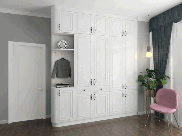 ▲ 如果做全封闭式的圆弧门柜,就能彻底解决积灰问题,整体性更强;但中部留空做开放式层板设计,则方便随手放置些小物件,装几个挂钩的话,还能收纳隔夜衣。