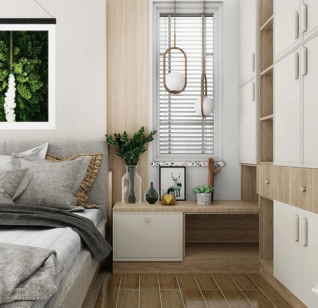 卧室太小,放不下床头柜该怎么办?这时候就可以结合衣柜做一体化设计了。