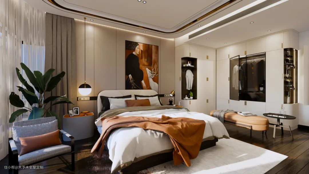▲ 比起方方正正、棱角分明的普通衣柜,圆弧门衣柜的弧形边角设计更具设计感和独特性,颜值蹭蹭蹭上涨,不管是北欧风还是轻奢风都能轻松驾驭,还提升了整间卧室的格调。