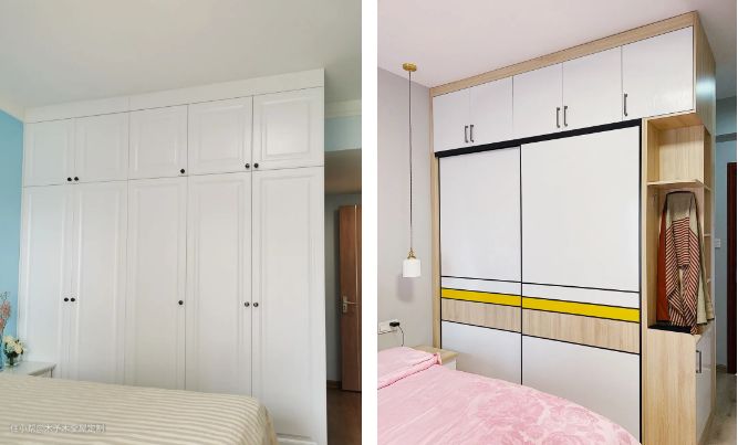 不知道大家发现没有,一般的衣柜虽然会做到顶,但柜门却是分开的,有2-3层,如果换成“一门到顶”的衣柜,颜值就妥妥的提升了↓↓