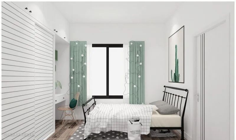 ▲ 衣柜放床尾,临窗的部分预留给书桌,光线明亮不伤眼;墙上装洞洞板+吊柜,增加收纳;衣柜整体用白色,卧室显大不局促。