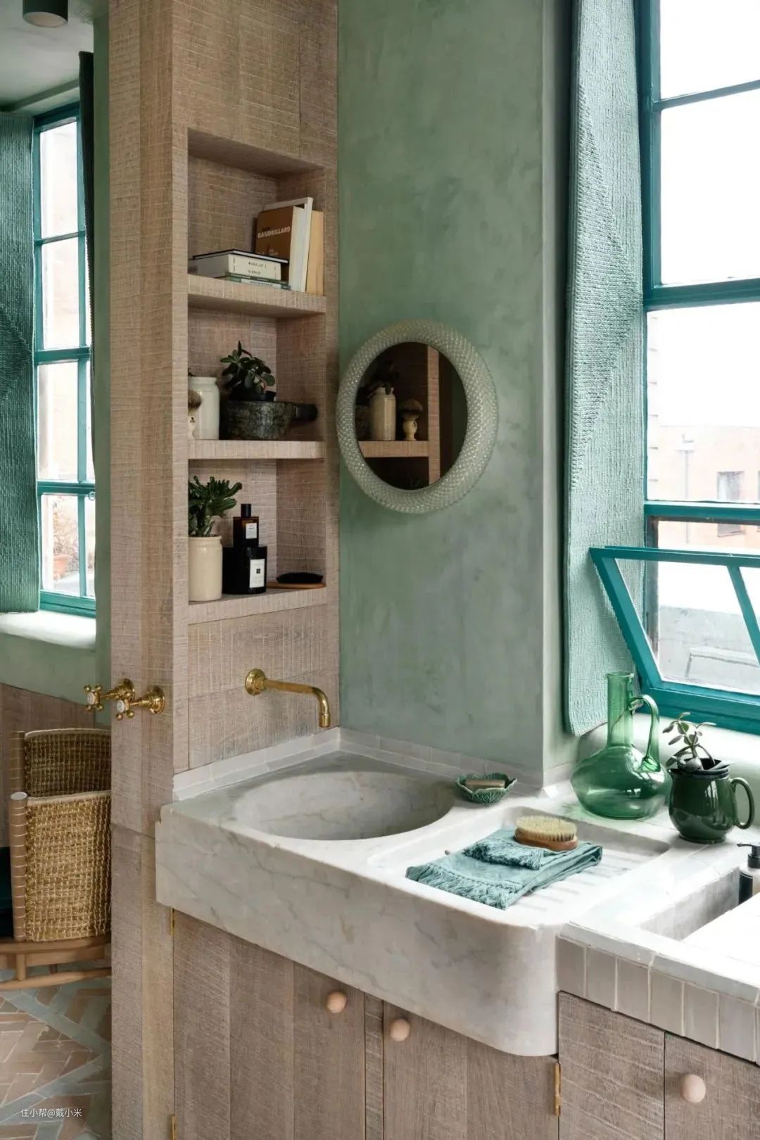 或者,洗手台可以不是主角,设置在角落处,节省空间也觉得温馨惬意。旁边依靠墙体设计储物格子,完全不用担心洗漱用品的摆放问题。