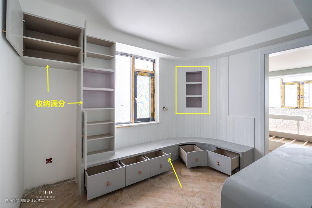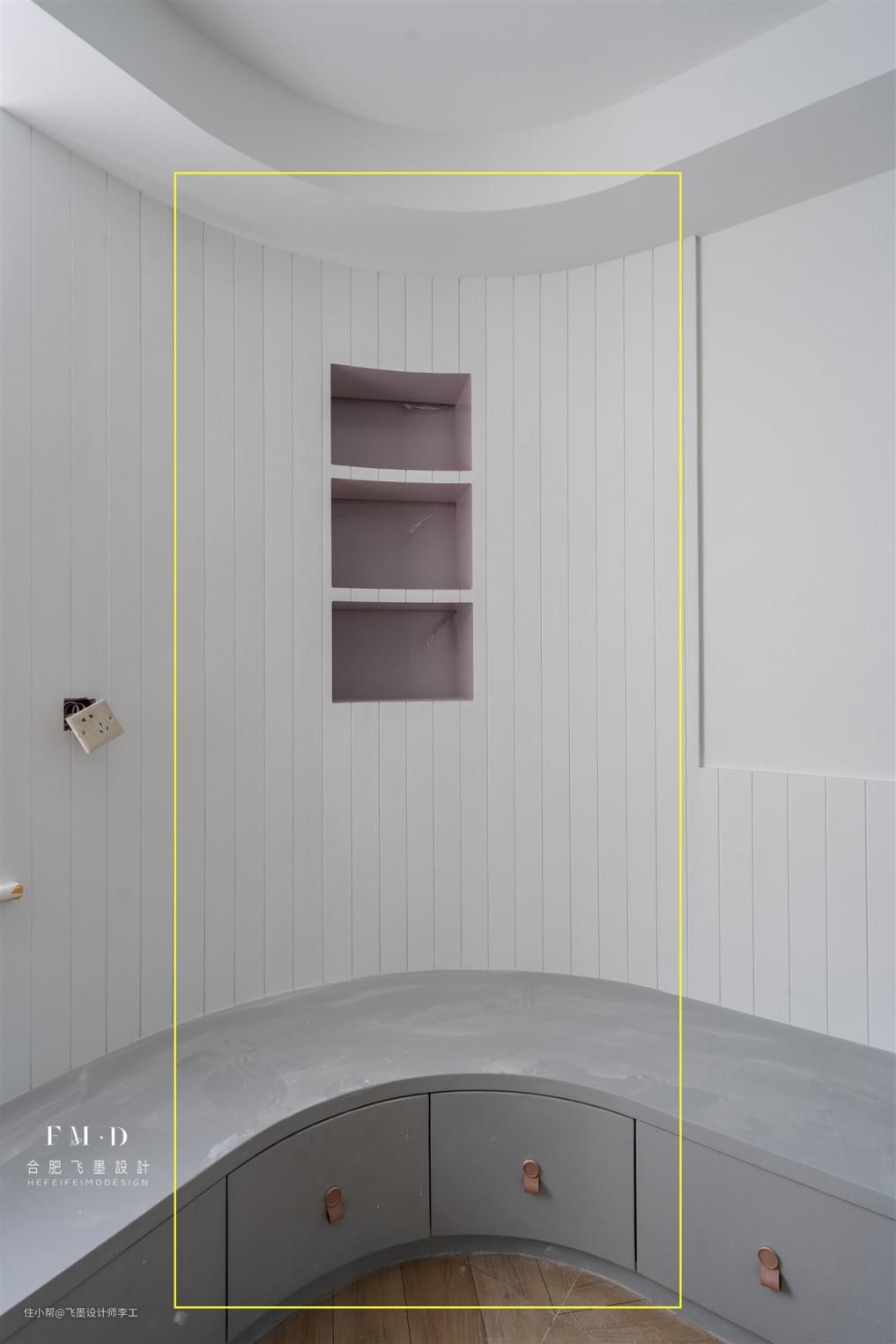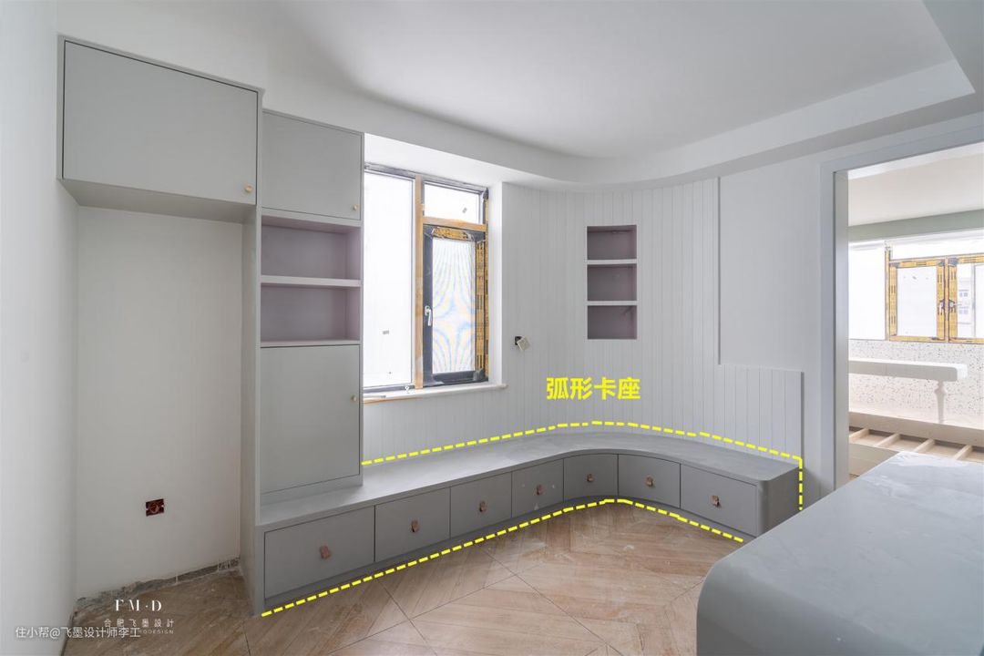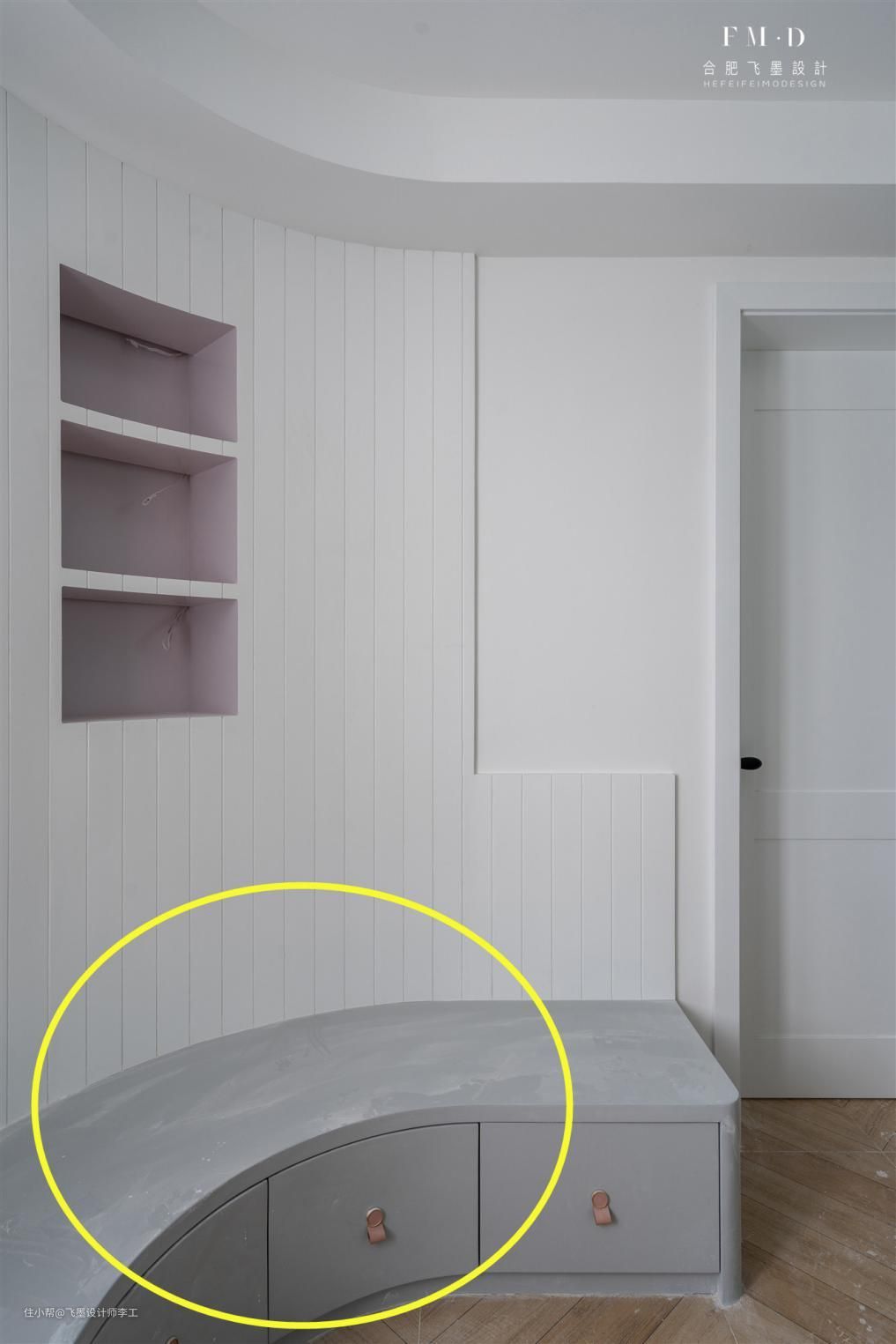 2、紧靠弧形墙面打制一整排弧形收纳卡座。