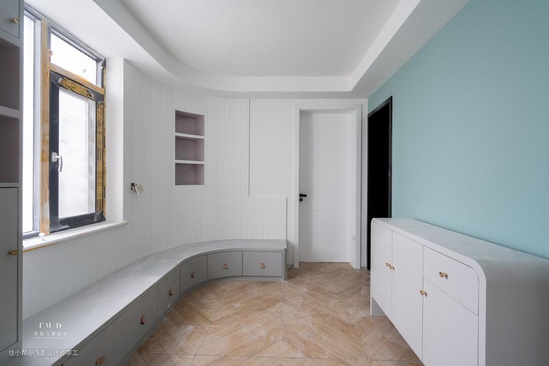 业主家是选择定制板,用钉枪等专业工具钉装上的,这样就成就了现在的弧形墙面。因为弧形墙面有一定厚度,所以还做了内嵌壁龛,一点点空间都不浪费,也难怪邻居过来了都称赞。
