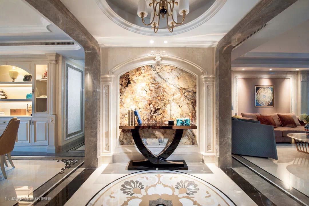 带纹理的巨型大理石赫然立于正中,配以拱门的造型,并用精美的雕花加以修饰,再加上一组欧式木柜,强烈的视觉冲击感一点点蔓延开来,庄重而优雅。