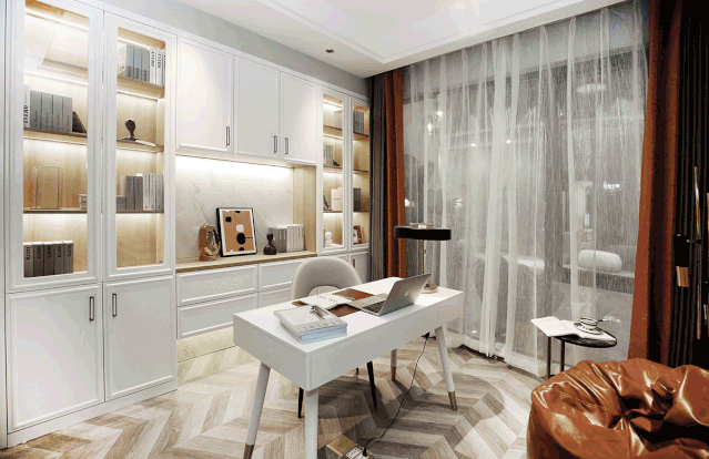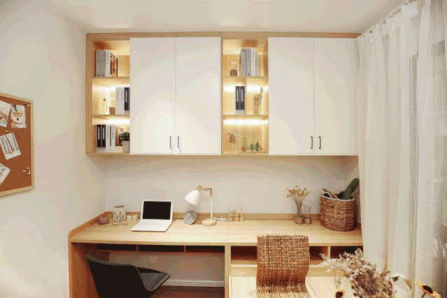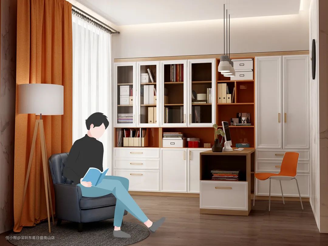 一面墙的书架,上边摆满心头好;一扇窗户,白天轻纱透进明亮的光;一张桌子,放得下电脑和工作;一盏落地灯,夜晚蜷进灯下柔软的沙发。
