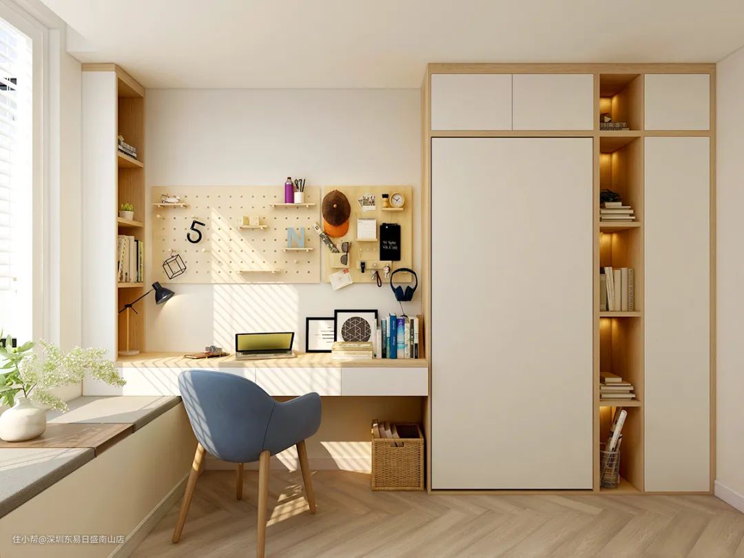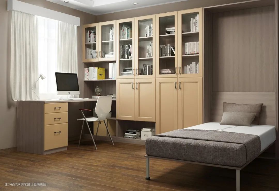 ✓ 嵌入床体的定制组合柜,更适合做偶尔的客卧。平时床嵌入柜体,隐形又美观,且收纳与活动空间都绰绰有余。