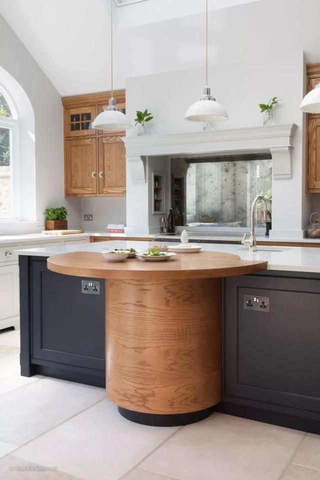 这类型的吧台有时候是半圆有时候则是弧形。作为孤岛的延伸或者像是另外嵌入的“入侵者”。在方形的厨房工作平台上加入圆形的元素在视觉上区分了空间和功能,材料上的变化更是带着人们从紧张的厨房准备工作转换到轻松休闲的吧台区域。