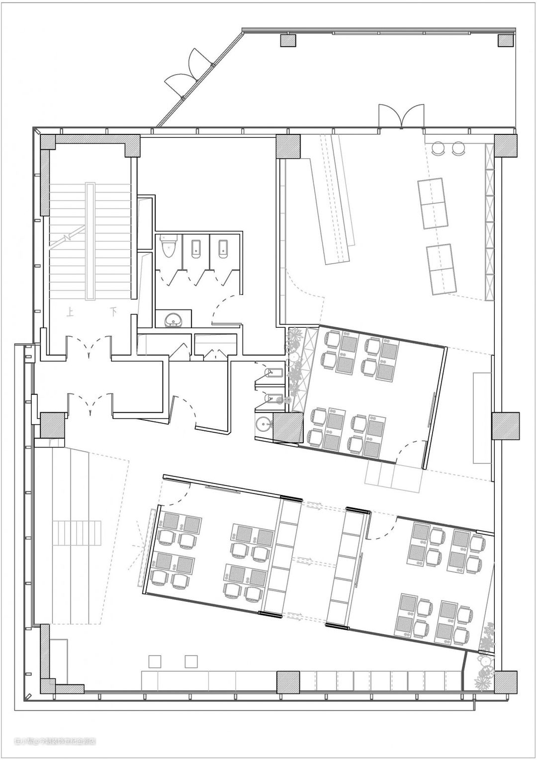 “黑白坊”为杭州重点围棋培训机构,多次获得国家奖项,非常荣幸接到黑白坊旗舰店的设计。从一开始接触这个项目,会让我回想起第一次妈妈教我下围棋,棋子之间的灵气让我瞬间感受到兵临城下的感觉;我那一刻的想法是想让更多人感受到这种浓厚的文化,下棋讲究的是意念与信念,置身其中仿佛周边的一切都会变的扭曲,所以我运用了不规则的几何造型衬托出空间变化,巨大的棋盘若隐若现的刻在其中,无论在何种时间都能千变万化中坚守棋艺的变数。这个想法也与棋院创始人不谋而合,把国粹文化传递出去…