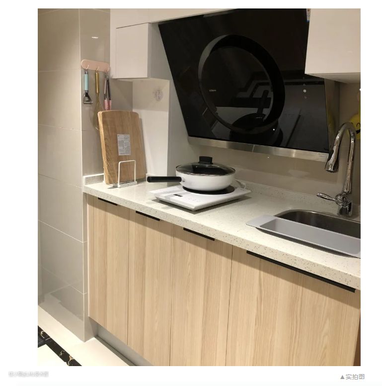 ▲与之相对的开放式小厨房,一字型布局动线流畅,转身就能开冰箱拿食材。白色吊柜+原木色地柜储物量充足,侧吸油烟机节省空间。侧墙角收纳了削皮刀、切菜板,免钉挂钩也派上了用场。