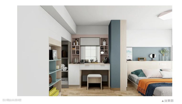▲左侧用收纳柜做隔断,区分睡眠区,还增加了超多收纳空间,充当床头柜,用处超多!