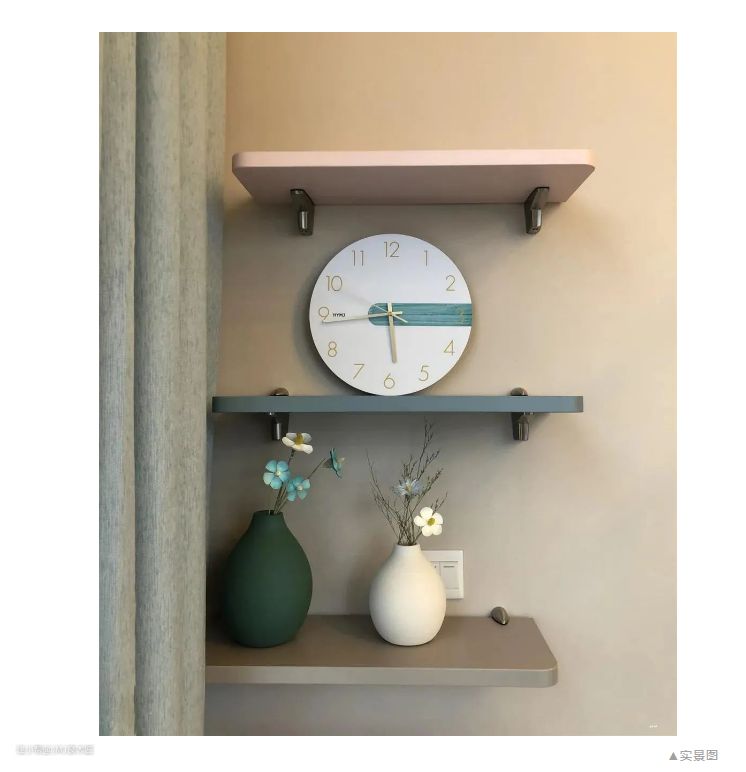 ▲飘窗墙边没闲着,三色搁板给钟、花瓶提供了一个展示空间,提升了空间的颜