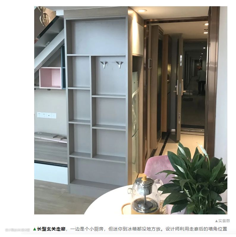 ▲长型玄关走廊,一边是个小厨房,但迷你到冰箱都没地方放。设计师利用走廊后的墙角位置定制收纳柜,对着厨房的这面挖空,完美嵌入冰箱。
