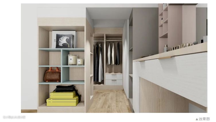 ▲衣帽间位置原本有横梁,既影响卧室整体颜值,还不便于空间利用。设计师巧妙定制了贴合横梁的衣柜,巧妙规避了这个问题,还增加超多储物空间。